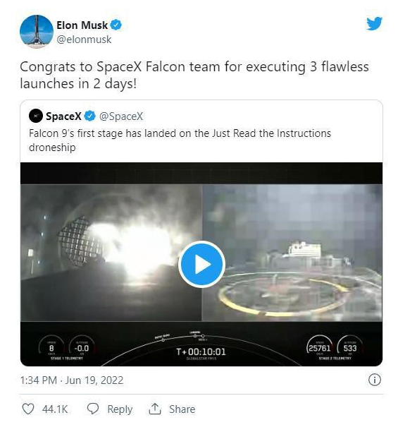 您的位置:首页新闻动态两天完成三次“发射”,马斯克祝贺 SpaceX 团队
